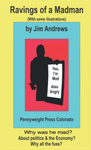 Why is he mad? What is he raving about? Where did he get his opinions? These editorials and other writings from Jim Andrews (who died in 2016) are still relevant today, because Democrats have only gotten worse! In these editorials you can learn about economics, small business (by a man who had one), and other things. Jim has a lot of opinions in this book, plus some things just for fun, as well as family stories, which he puts in to relieve the political and spiritual intensity that is in all the rest of the book. The variety you will find here is worth the reading. By the way I greatly enjoyed editing it, and I hope you enjoy reading it just as much.
